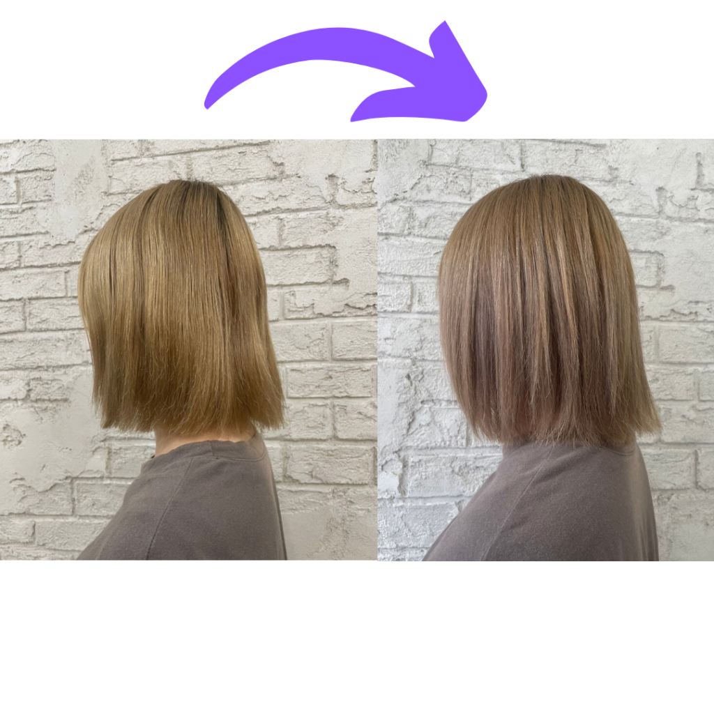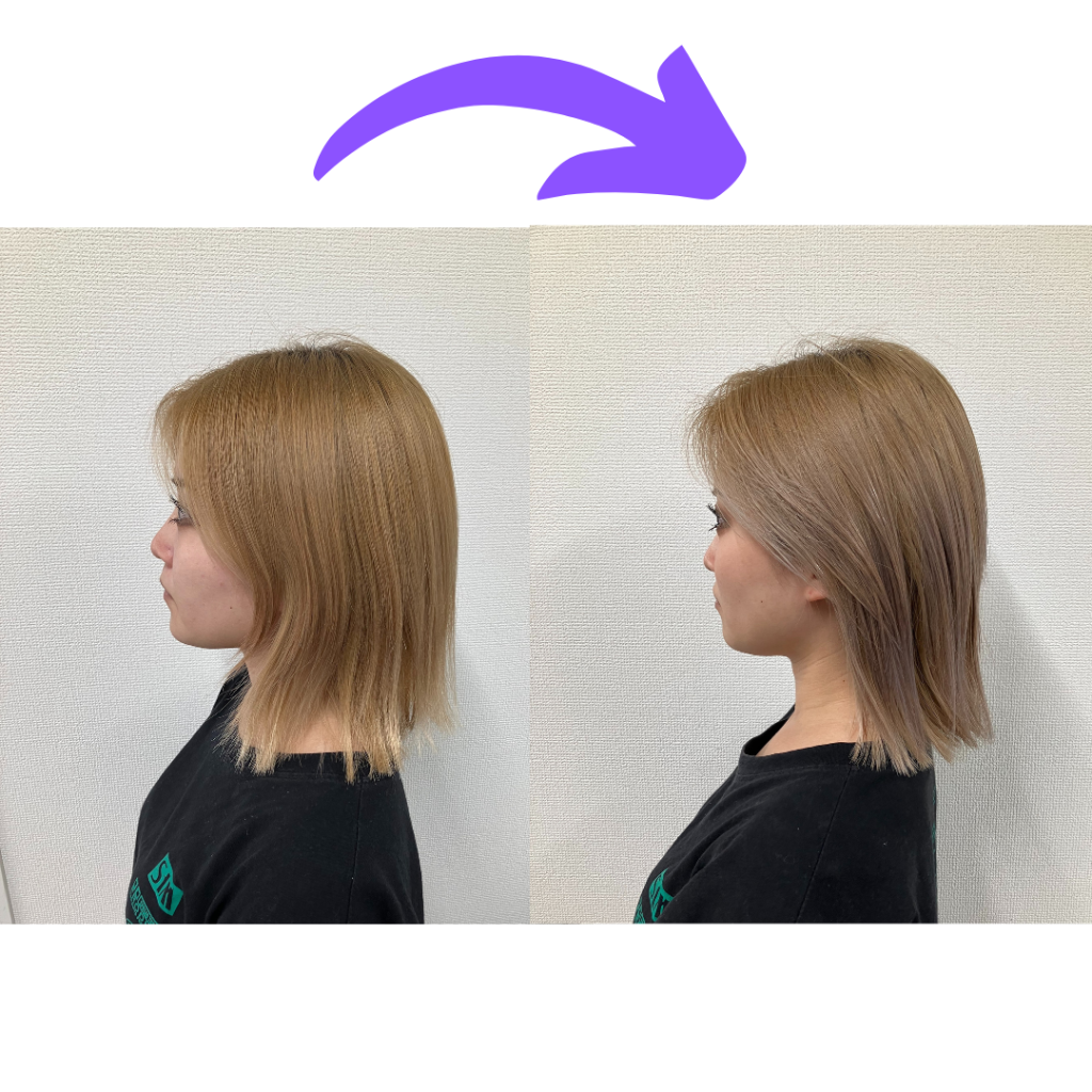 黄ばみがが完全に消えてくすんだ色に変化し、毛先の方は薄いパープルに変化しました。